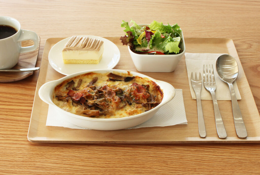 「海と空のカフェ」で特におすすめなのが古代米を使ったメニューです。なかでも今回おすすめするのは、宇多津産古代米をブレンドしたごはんに、宇多津入浜式の塩を使用したホワイトソースをかけて焼き上げた「古代米ドリアランチ」。