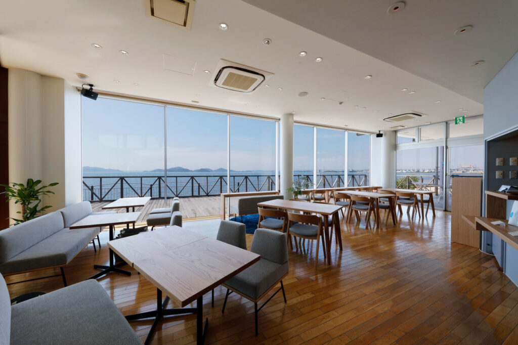 「海と空のカフェ」は、「四国水族館」の目の前にある道の駅「うたづ海ほたる」の中に地元宇多津町産の食材を使用したメニューが好評で、周りが海に囲まれていることで店内に入るとまるで海の上に浮いているかのような感覚でとても開放的な空間です。天気の良い日には瀬戸内海や瀬戸大橋を一望することができる最高なパノラマ‼